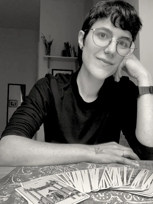 Greer De Maglie (they/them) has been studying and practicing tarot since 2020. They believe the cards can be used as a tool of self reflection, a way to illuminate the subconscious and for connecting to shared archetypal experiences.Their practice is trauma informed and inclusive.